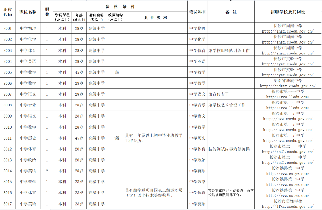 注:各招聘单位官网网址见《职位表》;长沙市南雅梅溪湖中学使用长沙市南雅中学官网网址发布相关信息。